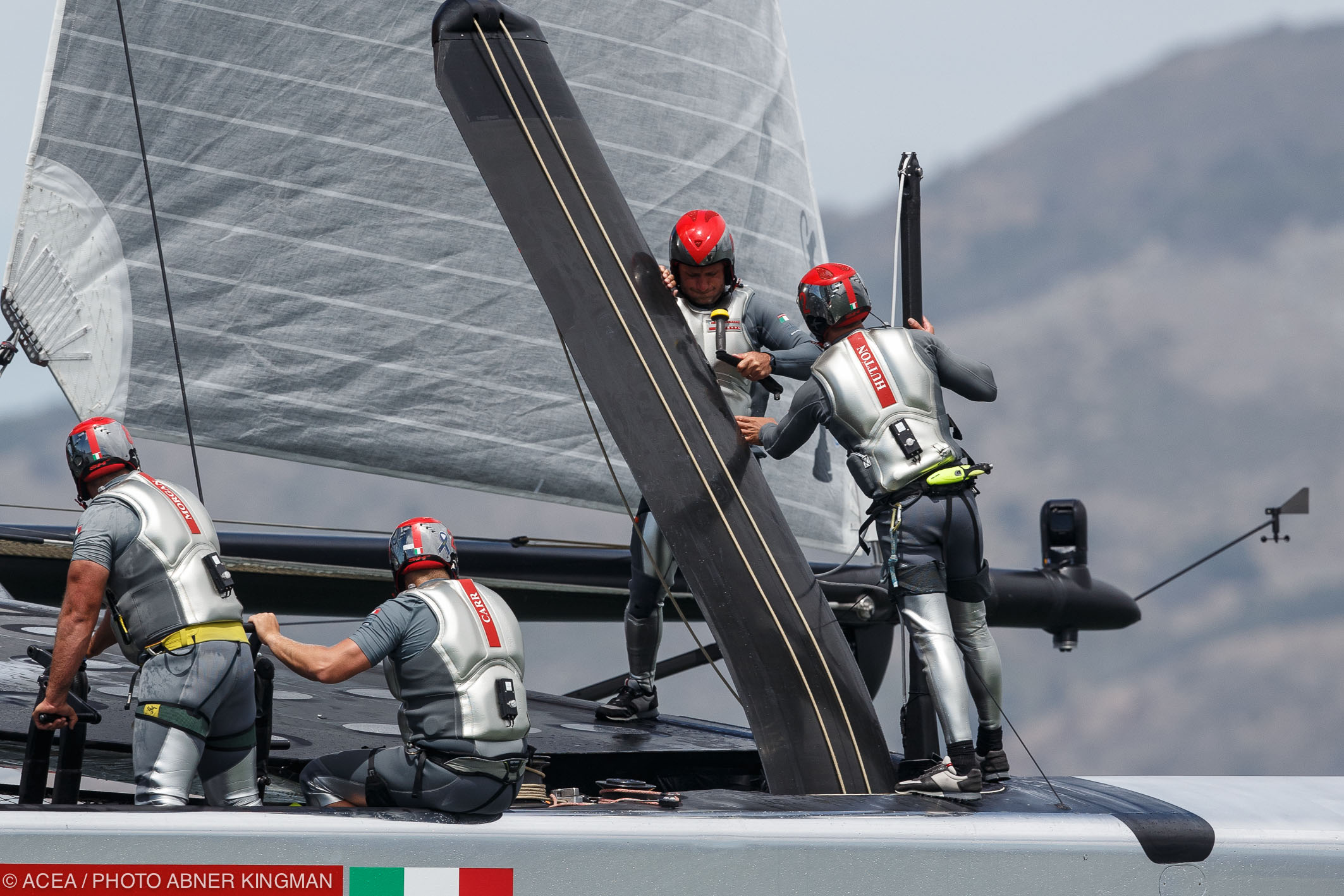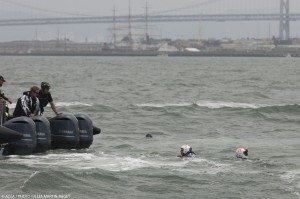 Giornata drammatica a San Francisco nella prima della finale Louis Vuitton Cup, dove Emirates Team New Zealand conquista un punto ma quasi si ribalta e Luna Rossa si ferma quasi subito dopo la partenza. Doveva essere il primo grande spettacolo… e per alcuni lo è stato. Ma il primo giorno poteva mettere in discussione tutta la selezione sfidanti. Il “nose diving” della barca kiwi è non è per niente bello: capita quando un catamarano infila una prua in acqua, che comincia a voler scendere verso il fondo, spinto da tutta la forza della velocità e delle vele. E’ lo stesso evento che è costato a Oracle e Artemis il ribaltamento. Capita nel momento più pericoloso per un catamarano, quando si poggia e la barca accelera repentinamente: in queste condizioni il carico sullo scafo interno è al massimo. I progettisti lo sanno bene, e soprattutto quelli di Emirates Team New Zealand avevano studiato a lungo la faccenda, per il momento il risultato si vede. Almeno all’apparenza New Zealand è intera, anche se ci vorranno tutti i controlli per capire che la traversa ha subito qualche danno. Emirates nella prima regata contro Luna Rossa, già ferma per una rottura a una deriva, stava navigando a 40 nodi spinta da una raffica quando qualcosa è andato storto è ha infilato le prue degli scafi in acqua passando dalla condizione di aliscafo a quella di sommergibile per il tempo sufficiente a perdere in mare due uomini, i più grossi dei grinder e forse per questo meno agili, per fortuna hanno riportato solo qualche ammaccatura e sono arrivati a nuoto alla chase boat che li aspettava. Sono Chris Ward, uno dei tanti veterani che fanno la forza dell’equipaggio kiwi, grinder fin dal 92 contro il Moro di Venezia, e Rob Waddell vincitore di una medaglia d’oro alle Olimpiadi con il canottaggio a Sydney, grinder nel 2003 e nel 2007 dove era anche boat captain. Dopo l’incidente i kiwi hanno navigato molto prudentemente, alzando in foiling la barca molto poco, probabilmente per sentire le reazioni della struttura.